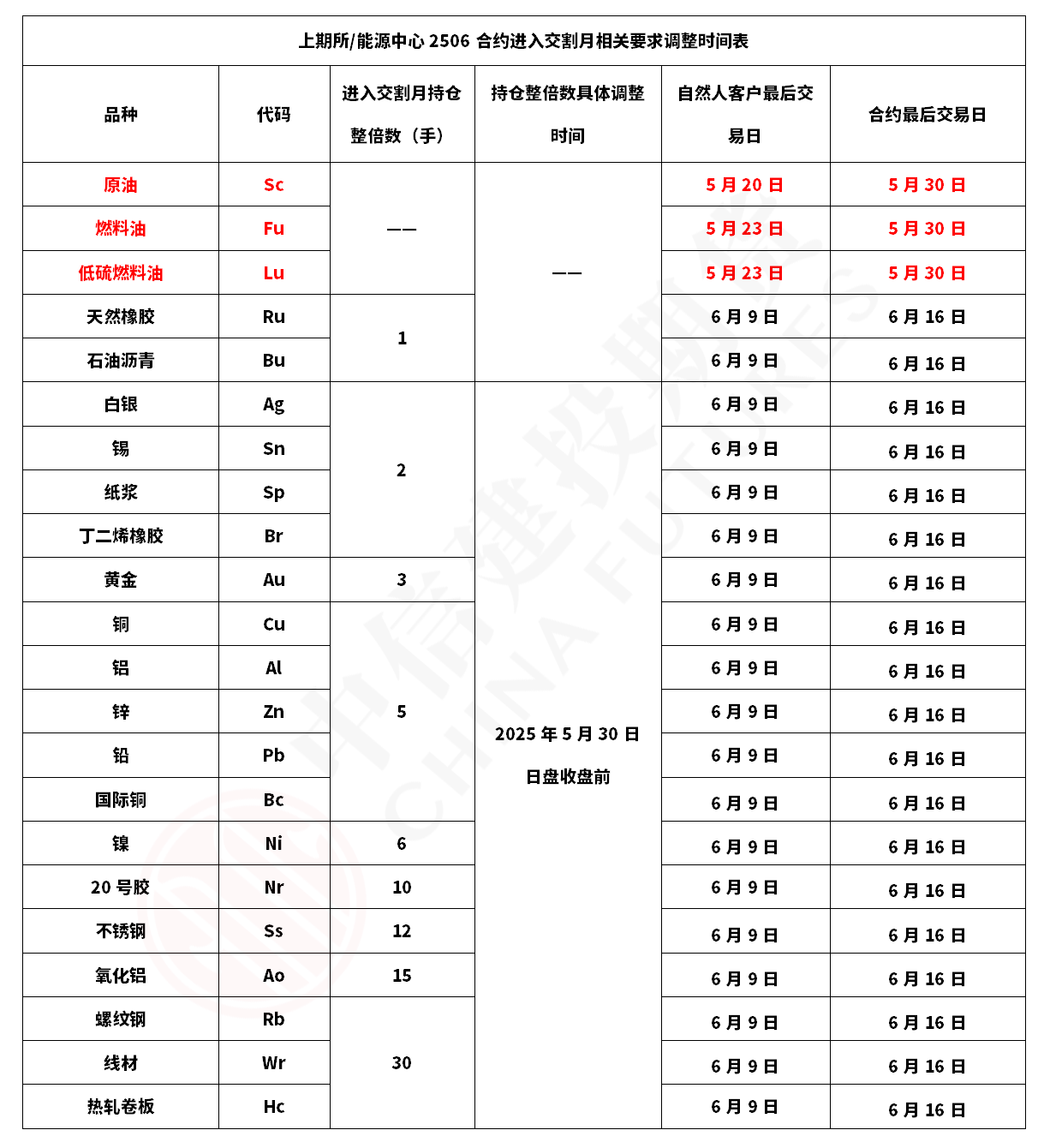 二、根据上期所、能源中心风险控制管理办法规定,客户在交割月前一月最后一个交易日收盘前须将期货合约持仓调整为相应整倍数,自然人客户如需持仓2506合约进入交割月,须在5月30日下午收盘前将: