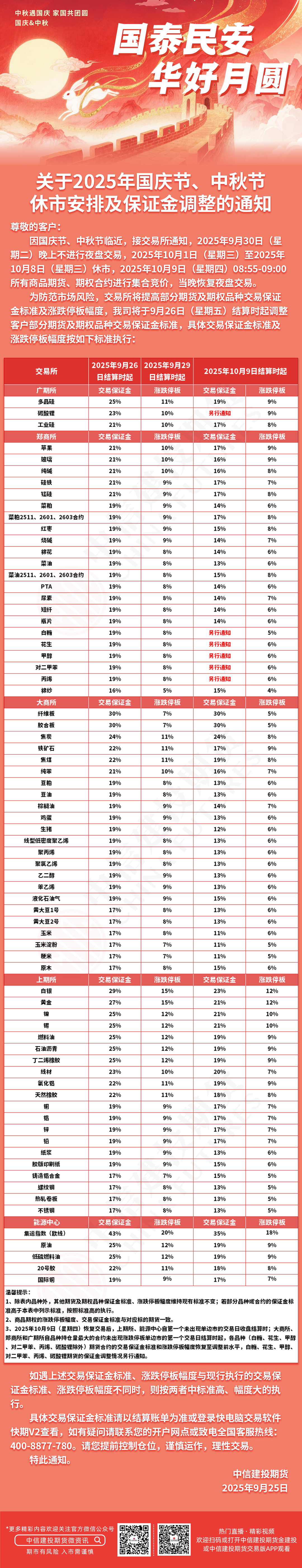 关于2025年国庆节、中秋节休市安排及部分期货、期权品种交易保证金标准和涨跌停板幅度调整的通知