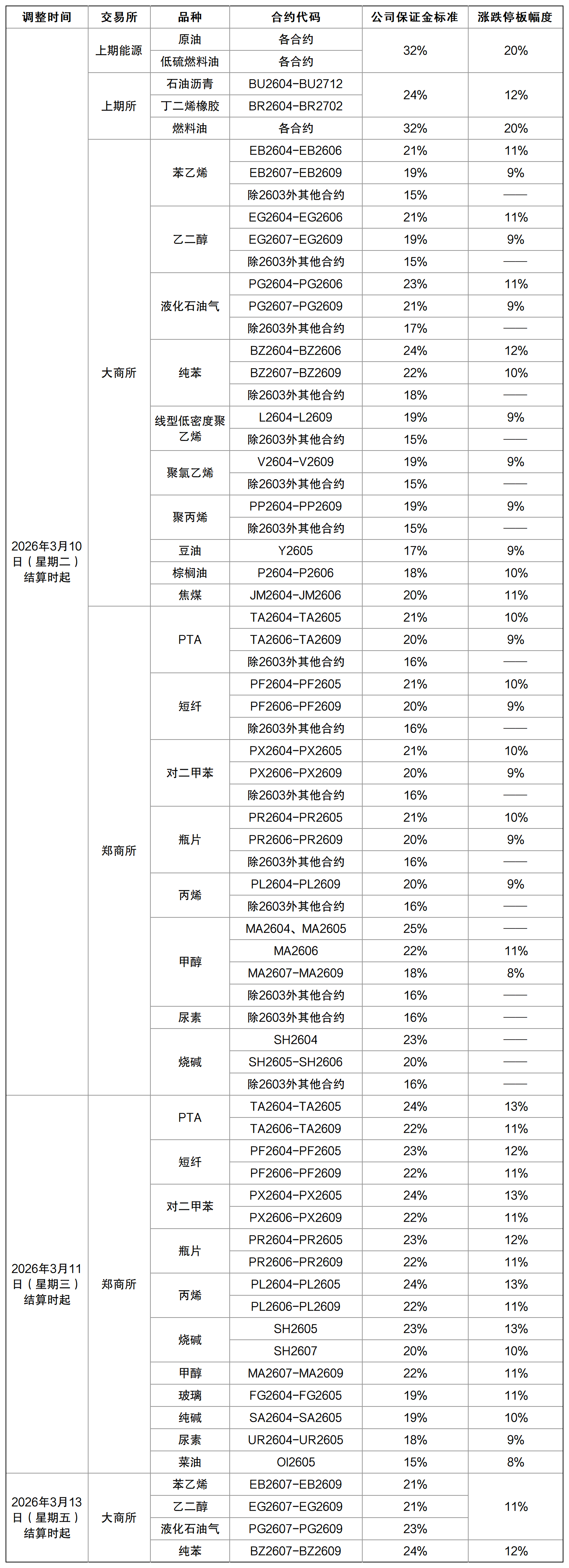 根据上能发〔2026〕27号 、上能发〔2026〕31号、上期发〔2026〕93号、上期发〔2026〕99号、大商所发〔2026〕73号、郑商函〔2026〕244号通知,经公司研究决定,自2026年3月10日(星期二)、2026年3月11日(星期三)和3月13日(星期五)收盘结算时起,调整部分期货合约公司保证金标准及涨跌停板幅度,具体调整情况如下: