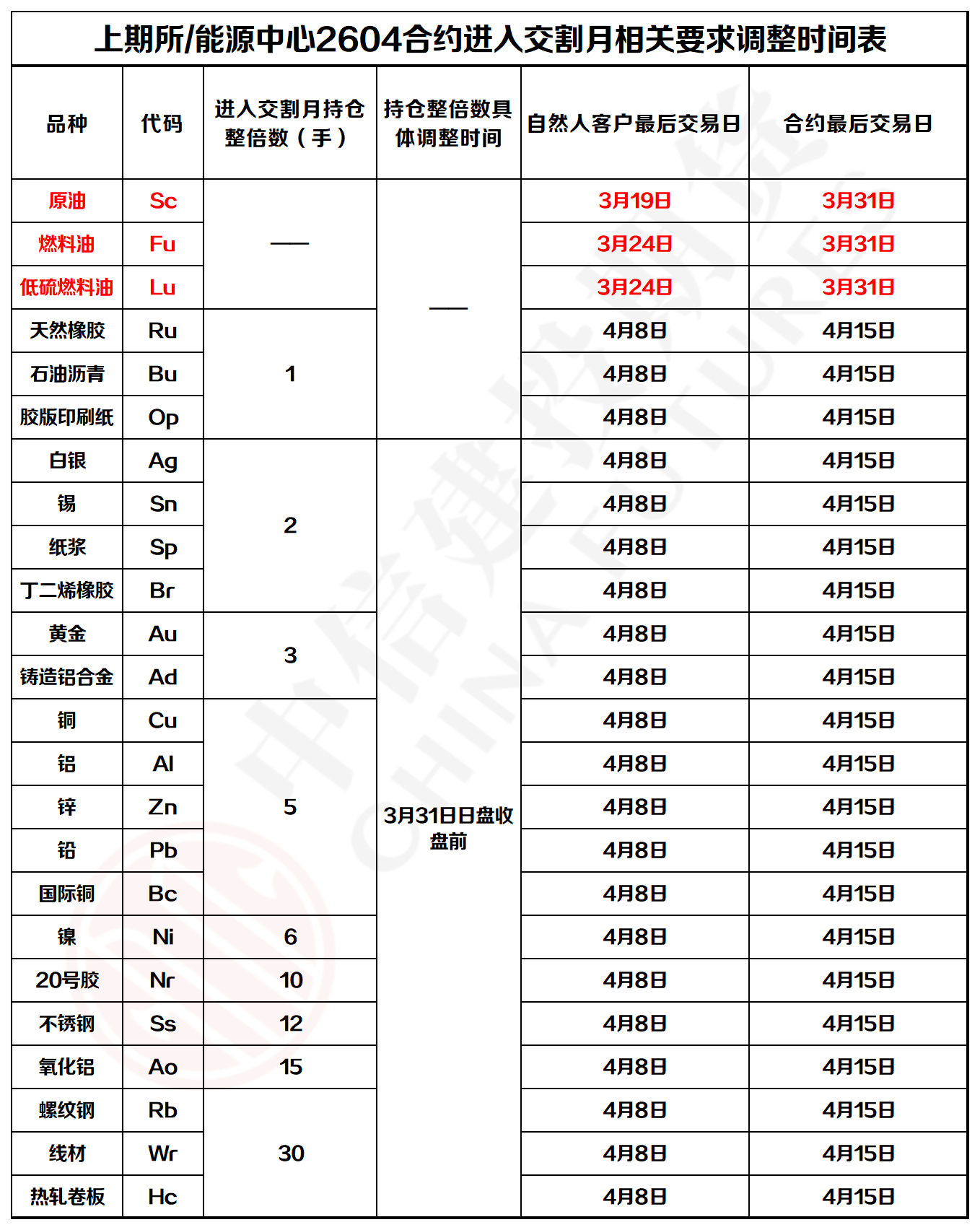 二、根据上期所、能源中心风险控制管理办法规定,客户在交割月前一月最后一个交易日收盘前须将期货合约持仓调整为相应整倍数,客户如需持仓2604合约进入交割月,须在3月31日下午收盘前将: