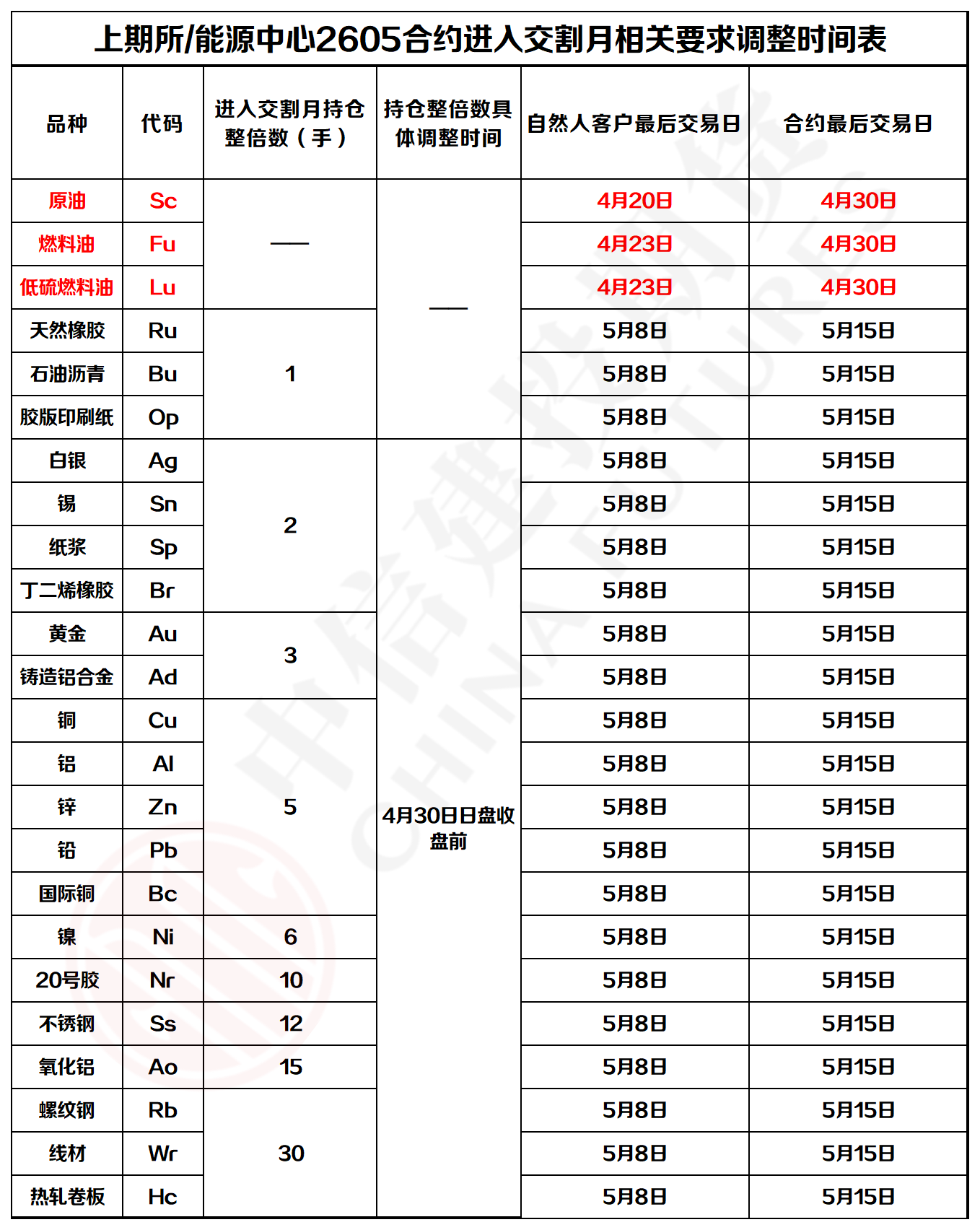 二、根据上期所、能源中心风险控制管理办法规定,客户在交割月前一月最后一个交易日收盘前须将期货合约持仓调整为相应整倍数,客户如需持仓2605合约进入交割月,须在4月30日下午收盘前将:
