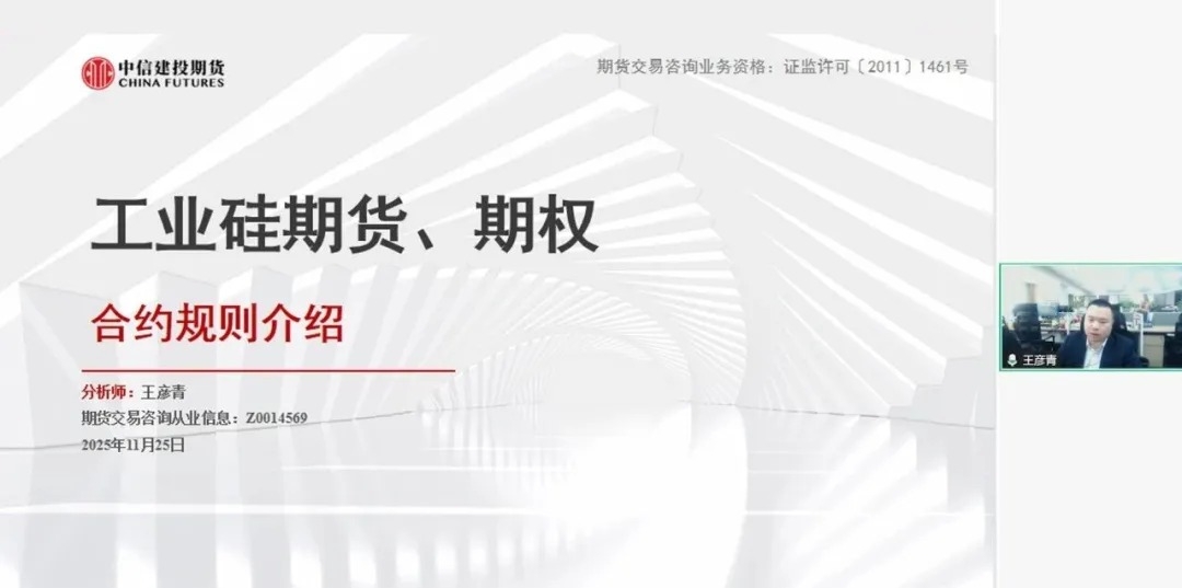 中信建投期货光伏&贵金属首席分析师王彦青开展了工业硅期货、期权合约规则专题分享。内容涵盖工业硅期货交易单位、交割流程、费用标准,期权分类、行权机制等核心要点,深入拆解期现结合的实操逻辑,结合国标与广期所细则,精准传递交易规范与风险管控要点。