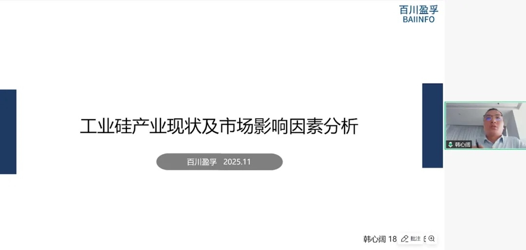 最后,百川盈孚高级分析师韩心阔对工业硅产业现状及市场影响因素专题进行了分享。内容涵盖2025年工业硅价格走势、产能产量分布、供需格局,深入剖析硅石等原材料及电力成本影响,分析2026年产能淘汰与成本趋势,解读政策及国际市场作用。