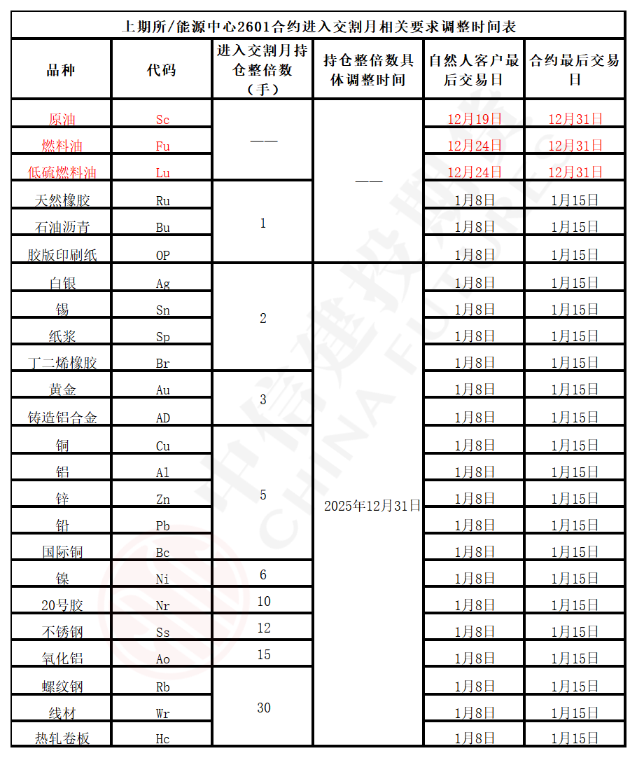 一、根据大商所、郑商所、广期所交割管理办法规定,自然人客户不得持仓进入交割月。为防范违规进入交割月,如您持有2601期货合约,应在2025年12月30日下午收盘之前将2601期货合约持仓调整为0手,若未在上述时间将合约持仓调整为0手,2025年12月31日开始公司或交易所将有权对该持仓进行强行平仓。