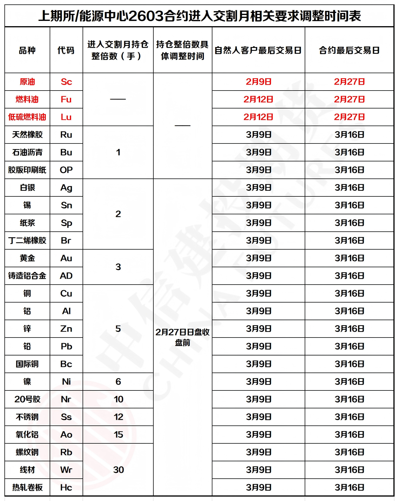 8、RB2603、WR2603、HC2603合约持仓调整为30手的整倍数,若前述合约持仓不符合整倍数持仓要求,进入3月将被交易所执行强平,强平盈利将被交易所没收,亏损自负。SC2603、BU2603、FU2603、LU2603、RU2603、OP2603合约不受整倍数要求限制。